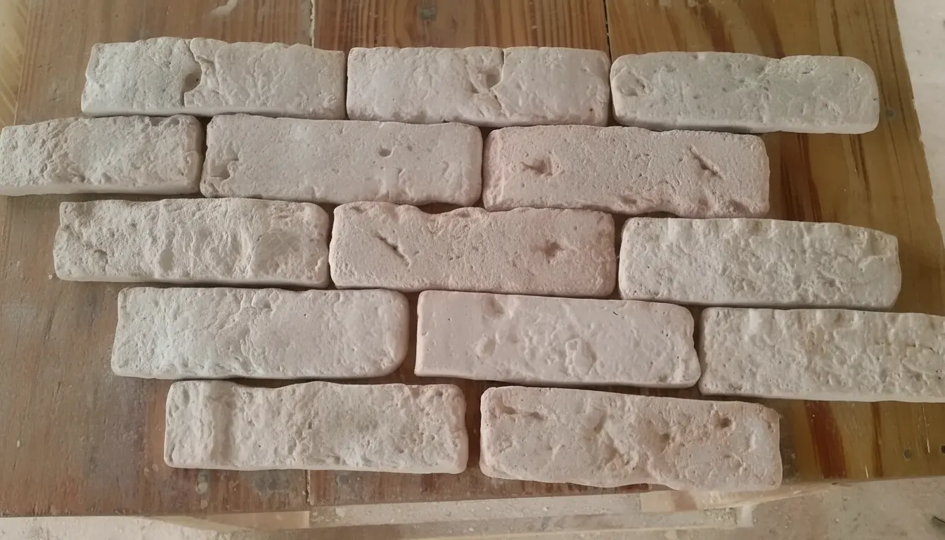 Os Tijolinhos Aparentes Cimentícios são produzidos com cimento branco, pó de mármore e pedrisco de mármore